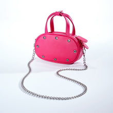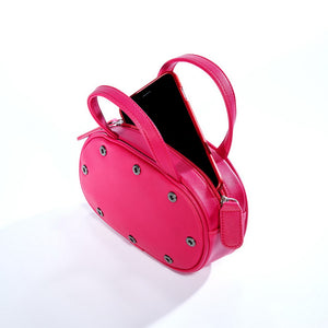 Dimensions of the body of the bag: approximately 8" long x 5" tall x "2.5" wide (approx 20 cm x 12cm x 6m), which - informal sampling suggests - should be big enough for a typical smartphone + compact + lipstick + keys + cards + eyeglass case; the bag doesn't include those items. Material: polyurethane. This bag, patent pending, is to come with: sewn-on handles of the same color as the shell of the bag; three different swappable pairs of swappable mood panels (Pomegranate Red Sheen, Glossy Indigo Purple, Cerulean Blue Sheen; allow for slight variations from this photo), which are optional to snap on / off quickly, so that you can show the bag either without panels for a touch of steam punk or with different panels or with panels showing off your favorite stickers (to purchase separately); faux canvas shoulder strap + silverish shoulder chain (or you can buy eg a designer "guitar strap" separately to attach to the bag to add your personal pizzazz).